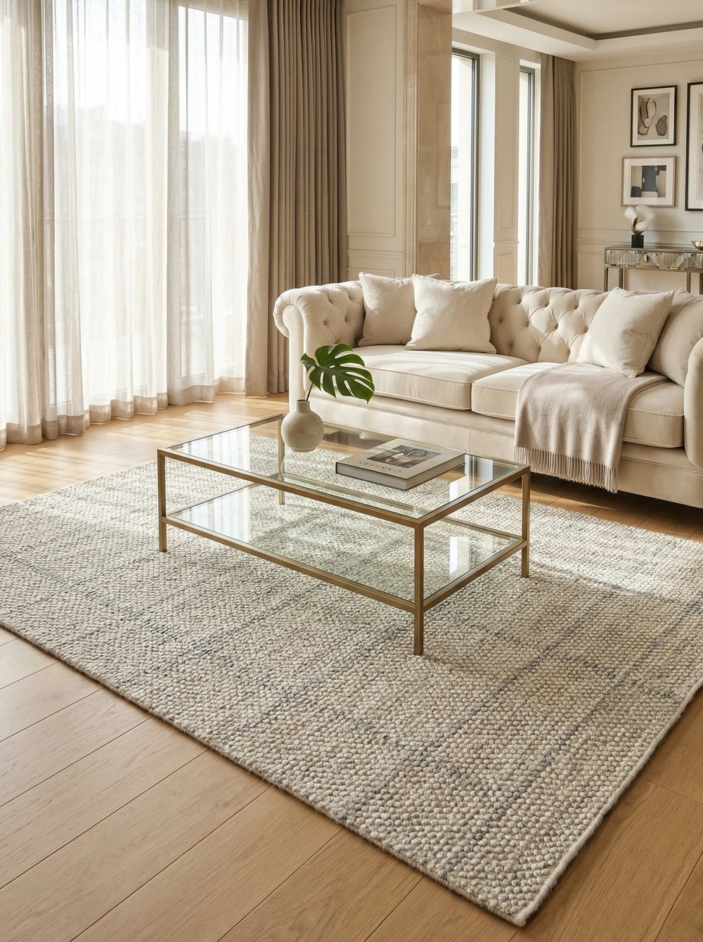 上質なニュージーランド産ウールを使用しており、やわらかく心地よい肌触りが特徴です。自然な風合いと落ち着いた色合いが、お部屋に温もりと上品さをもたらします。